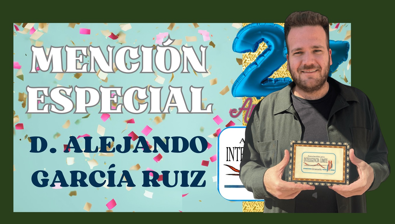 Conceder este mención a Alejandro es ensalzar su humildad, su personalidad y su manera de ser. Por ese motivo, la Junta Directiva celebrada en sesión ordinaria en la sede de la Asociación pro Inteligencia Límite de Granada, sita en C/ Ziries nº4 bajo (Granada) el 10 de Marzo de 2.025 aprobó por unanimidad que la Mención ESPECIAL 2025 fuese concedida a Dª. ALEJANDRO GARCÍA RUIZ, por su implicación y compromiso con nuestra entidad y nuestras familias.