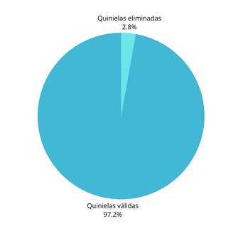 De las 1.487 quinielas registradas se han anulado 42 formularios por estar mal rellenos, principalmente por haber señalado todas las casillas o haber utilizado el documento para expresar opiniones acerca de la discapacidad. Tras anular las quinielas no válidas, el valor a tener en cuenta en la investigación ha sido el dado por las 1.445 quinielas rellenadas correctamente.